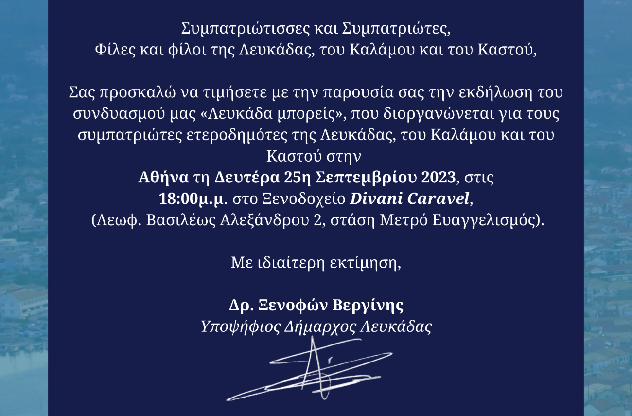 Πρόσκληση Ξενοφώντα Βεργίνη Υποψήφιος Δήμαρχος Λευκάδας “Λευκάδα μπορείς”, για τους συμπατριώτες ετεροδημότες της Λευκάδας, του Καλάμου και του Καστού στην Αθήνα