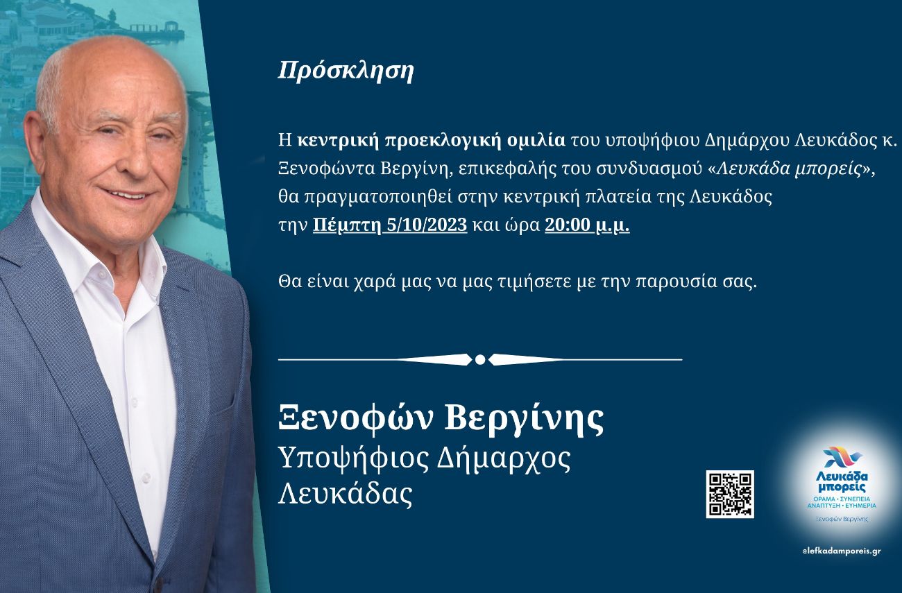 Πρόσκληση Ξενοφώντα Βεργίνη Υποψήφιος Δήμαρχος Λευκάδας “Λευκάδα μπορείς”, της κεντρικής προεκλογικής ομιλίας στη Λευκάδα