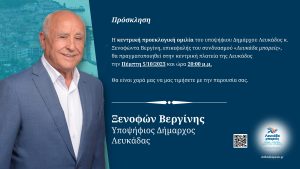 Η κεντρική προεκλογική ομιλία του υποψήφιου Δημάρχου Λευκάδος κ. Ξενοφώντα Βεργίνη, επικεφαλής του συνδυασμού «Λευκάδα Μπορείς», θα πραγματοποιηθεί στην κεντρική πλατεία της Λευκάδος την Πέμπτη 5/10/2023 και ώρα 20:00 μ.μ.